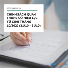 Từ cuối tháng 10/2020 (từ ngày 21/10 – 31/10) sẽ có các chính sách quan trọng trong lĩnh vực Môi trường; Thương mại, đầu tư; Bưu chính, viễn thông,... có hiệu lực thi hành, các chính sách cụ thể bao gồm:
