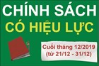 Từ cuối tháng 12/2019 (từ ngày 21/12/2019 - 31/12/2019) sẽ có các chính sách quan trọng trong lĩnh vực Ngân hàng, Hải quan, Tiền lương,… có hiệu lực thi hành, các chính sách cụ thể gồm có: